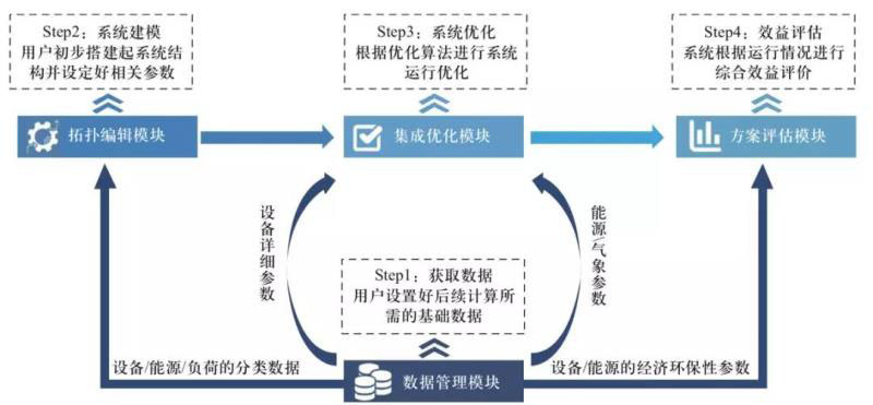 CloudIEPS包含四大模塊,分別是數(shù)據(jù)管理模塊、 拓?fù)渚庉嬆K、集成優(yōu)化模塊和方案評估模塊,通過流程化設(shè)計引導(dǎo)用戶快捷操作,各模塊相互配合協(xié)作,共同完成綜合能源系統(tǒng)的規(guī)劃設(shè)計。