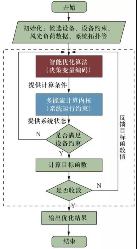 在能源互聯(lián)網(wǎng)規(guī)劃中,由于系統(tǒng)還未建成運行,數(shù)字孿生參與其中的主要作用是對規(guī)劃系統(tǒng)建模仿真,并將結(jié)果反饋給規(guī)劃主體以指導(dǎo)規(guī)劃決策。數(shù)字孿生可以檢驗運行方案的可行性,計算運行成本、資源短缺量、碳排放量等指標(biāo)評估運行方案的效果,并提供系統(tǒng)工作點詳細(xì)信息。利用攝動參數(shù)后的多次仿真,能夠幫助運行優(yōu)化尋找搜索方向。基于數(shù)字孿生仿真驅(qū)動的優(yōu)化算法如下圖所示: