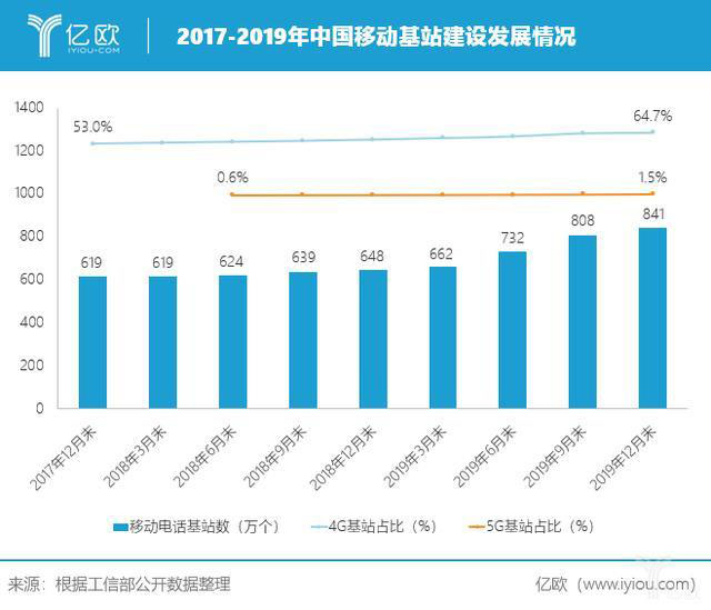 基站建設(shè)方面,根據(jù)工信部統(tǒng)計數(shù)據(jù),截至2019年底,中國新增基站174萬個,基站總數(shù)超過841萬個,其中4G基站占比64.7%,約為544萬個,5G基站總數(shù)超過13萬個。雖然2019年基站建設(shè)仍以提升4G網(wǎng)絡(luò)覆蓋能力為主,5G基站總數(shù)占比不足2%,但作為5G網(wǎng)絡(luò)的建網(wǎng)初期,三大運營商已經(jīng)紛紛加大了基站網(wǎng)絡(luò)投資。