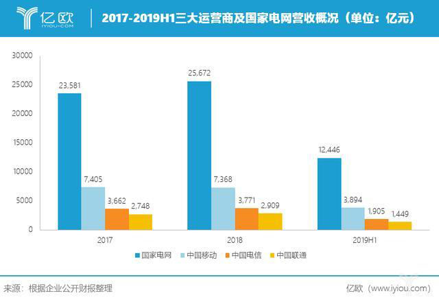 其次,從營收來看,2018年中國移動、中國電信、中國聯(lián)通三家運營商全年營收分別為7368億元、3771億元和2909億元,而國家電網(wǎng)2018年全年營收則達到了25672億元,營收體量遠超三大運營商之和。