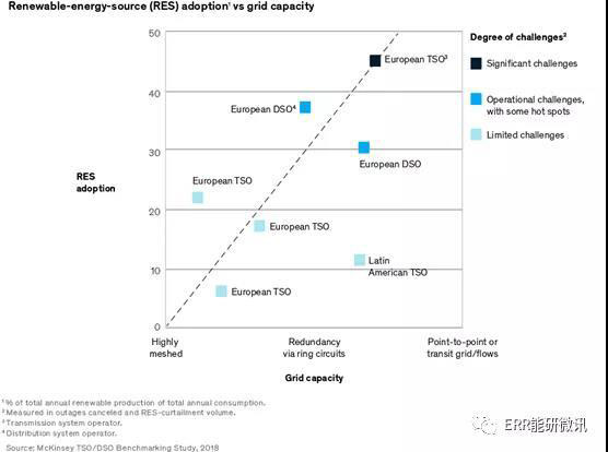 今天很多輸配電網(wǎng)運(yùn)營商都面臨這種挑戰(zhàn)。在最近的一次全球電網(wǎng)運(yùn)營商的標(biāo)準(zhǔn)討論中,百分之七十的應(yīng)答者表示他們希望增加相關(guān)規(guī)定,比如短期內(nèi)頻繁取消停運(yùn)以及停運(yùn)可再生發(fā)電設(shè)施。這些運(yùn)營商面臨的困難程度和他們所處市場中的可再生能源滲透率以及電網(wǎng)容量緊密相關(guān)(圖1)。耦合性高的電網(wǎng)通??梢韵{更多的不可預(yù)知的可再生能源的接入;反之電網(wǎng)冗余度有限的地方,運(yùn)營者面臨消納水平更低的挑戰(zhàn)。一些輸配電網(wǎng)運(yùn)營商正在處在后者的困境中。