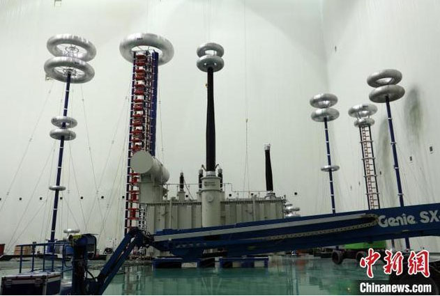 圖為±800千伏青豫特高壓直流工程青南換流站首臺變壓器正在國網(wǎng)青海電力高海拔高電壓實(shí)驗(yàn)室高壓試驗(yàn)大廳進(jìn)行出廠試驗(yàn)。 謝莉蓉 攝