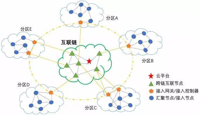 泛在電力物聯(lián)網(wǎng)一個特性是便于劃分片區(qū)。小到一個變電站,站內(nèi)安裝的局部放電、氣體組分、溫濕度、視頻、紅外等所有傳感器,依托于匯聚節(jié)點或接入節(jié)點構(gòu)建成一個小的區(qū)塊鏈。若干變電站間再通過接入控制器或接入網(wǎng)關(guān)構(gòu)建一個更大范圍的區(qū)塊鏈。這樣就將原始的區(qū)塊鏈切分為很多分區(qū),交易記錄將在不同分區(qū)并行處理。因此,可將圖1所示架構(gòu)改進(jìn)為圖2所示的分區(qū)并行聯(lián)盟鏈。根據(jù)區(qū)域或業(yè)務(wù)對電力設(shè)備泛在物聯(lián)網(wǎng)進(jìn)行合理分區(qū)即并行化處理,再通過跨鏈互聯(lián)節(jié)點在互聯(lián)鏈中與云平臺節(jié)點進(jìn)行數(shù)據(jù)及服務(wù)交易。片內(nèi)交易時的共識機制采用流水化技術(shù)優(yōu)化效率,并通過隨機輪換記賬節(jié)點集合機制進(jìn)一步提升效率,從而最終構(gòu)建一個更適用于電力設(shè)備泛在物聯(lián)網(wǎng)的分區(qū)并行高通量聯(lián)盟鏈。