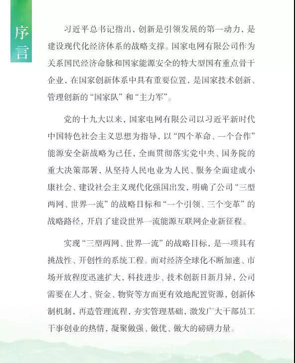 緊緊圍繞公司“三型兩網(wǎng)、世界一流”戰(zhàn)略目標(biāo),分序言、公司發(fā)展戰(zhàn)略核心要義、企業(yè)管理創(chuàng)新基本概念、公司管理創(chuàng)新總體思路、公司管理創(chuàng)新重點(diǎn)領(lǐng)域、公司管理創(chuàng)新工作體系、問(wèn)題解答等七個(gè)篇章,以全景的視角、系統(tǒng)的理念對(duì)公司管理創(chuàng)新工作進(jìn)行了詳細(xì)的闡述。