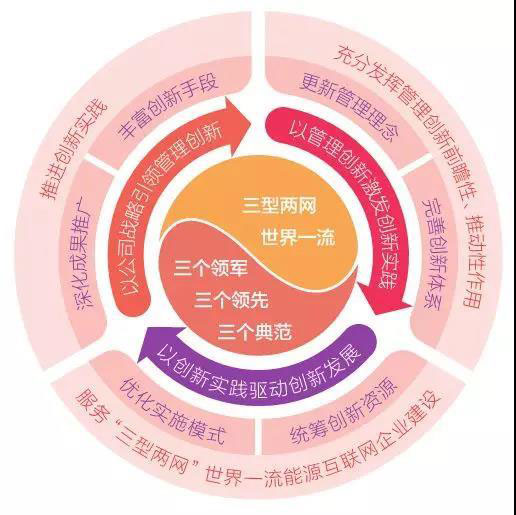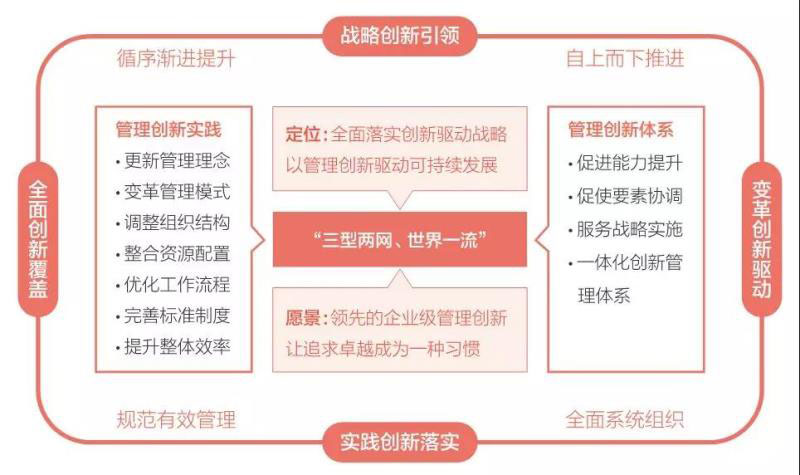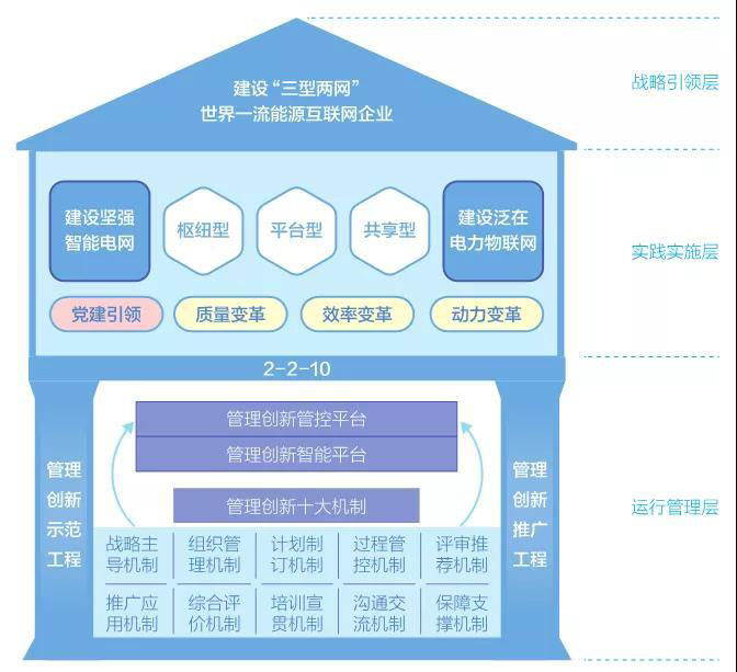 公司管理創(chuàng)新體系以公司“三型兩網(wǎng)、世界一流”戰(zhàn)略目標(biāo)為主線,分為戰(zhàn)略引領(lǐng)層、實(shí)踐實(shí)施層、運(yùn)行管理層。