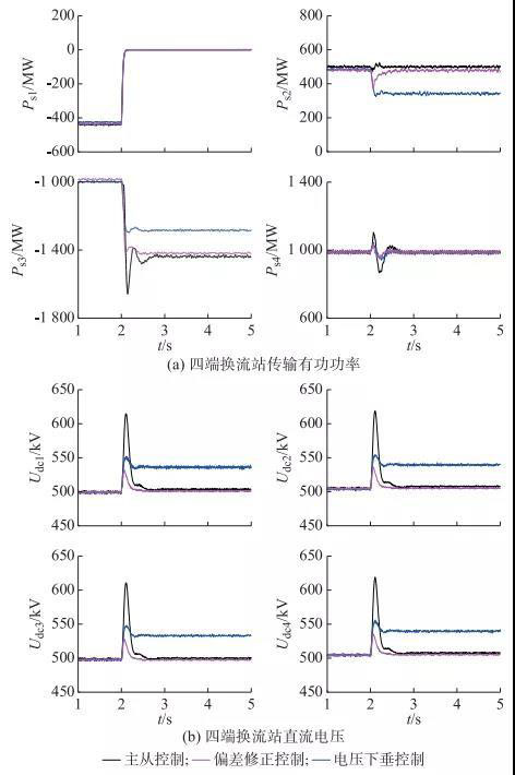 1)主從控制策略及其改進的電壓裕度控制策略均屬于單點電壓控制策略,任意時刻只有單個換流站參與功率調(diào)節(jié),對直流系統(tǒng)傳輸功率的動態(tài)調(diào)節(jié)能力不足,直流系統(tǒng)的功率波動容易引起較大的直流電壓波動,直流電壓動態(tài)穩(wěn)定性較差。