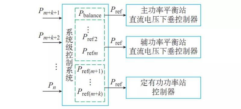主動功率平衡協(xié)調(diào)控制總體框架如圖1所示。選取具有較強有功功率調(diào)節(jié)能力的換流站作為主功率平衡站,采用電壓下垂控制方式;選取對傳輸功率有一定調(diào)節(jié)能力的換流站為輔功率平衡站,采用電壓下垂控制;對傳輸功率具有強迫要求的換流站,采取定有功功率控制,與無源網(wǎng)絡(luò)或大規(guī)模新能源電網(wǎng)相連的換流站,采取幅相控制。
