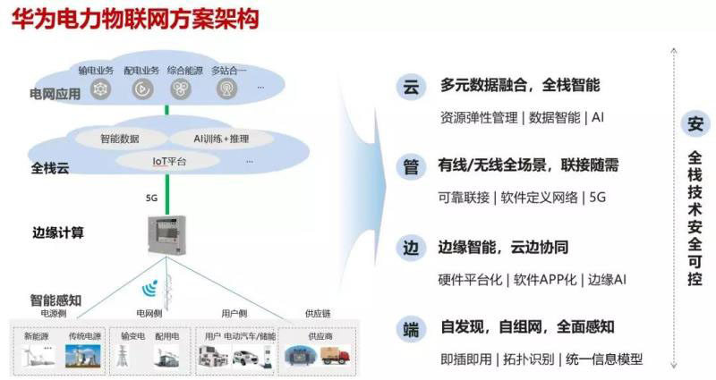 華為構(gòu)建了“云管邊端”的電力物聯(lián)網(wǎng)方案架構(gòu),并且由端到云全棧技術(shù)安全可控?!霸啤庇蒊oT平臺、智能數(shù)據(jù)和AI共同構(gòu)建數(shù)字化底座,并支撐電網(wǎng)業(yè)務(wù)云化應(yīng)用;“管”提供可靠聯(lián)接,有線/無線全場景隨需靈活聯(lián)接;“邊”具備邊緣計(jì)算、云邊協(xié)同和AI能力;“端”全面感知電網(wǎng)信息,支持自描述、自發(fā)現(xiàn)和即插即用。