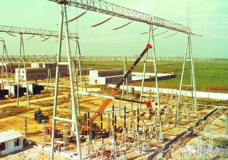 ▼1984年9月開(kāi)工、1987年11月竣工的山東第一座500千伏變電站——濰坊變電站。圖為安裝施工現(xiàn)場(chǎng)。