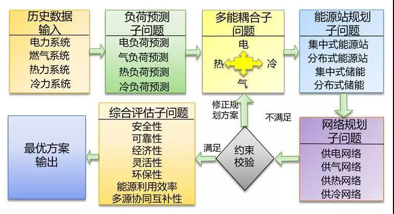 由于多能耦合密切,DIES的優(yōu)化空間廣泛。存在于源、網(wǎng)、荷、儲(chǔ)等 各個(gè)環(huán)節(jié)。國(guó)內(nèi)外對(duì) DIES規(guī)劃的早期探索主要集中于以某一種典型耦合設(shè)備(CHP和CCHP等)為核心或少數(shù)幾種確定的設(shè)備組成的小型供能系統(tǒng),以及“以熱定電”等相關(guān)運(yùn)行策略的制定,未充分考慮系統(tǒng)設(shè)備選型的優(yōu)化空間。后續(xù)DIES規(guī)劃一般基于Energy Hub理論,并通過(guò)分層建模求解實(shí)現(xiàn)設(shè)備選型選址定容與運(yùn)行調(diào)度方案的協(xié)同優(yōu)化。目前對(duì)DIES的規(guī)劃工作基本上側(cè)重于某一點(diǎn),如能源站規(guī)劃、能源網(wǎng)絡(luò)規(guī)劃、儲(chǔ)能規(guī)劃或綜合需求側(cè)管理等,尚未形成較成熟的源、網(wǎng)、荷、儲(chǔ)一體化規(guī)劃,對(duì)于各環(huán)節(jié)間的耦合與優(yōu)勢(shì)互補(bǔ)挖掘不足。綜合目前的研究工作,完整的DIES規(guī)劃應(yīng)如下圖所示。