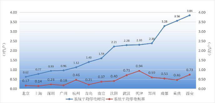 圖2:2018年全國特大及以上城市供電企業(yè)用戶平均停電時(shí)間和用戶平均停電頻率圖(統(tǒng)計(jì)口徑為1+2地區(qū))