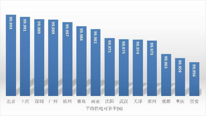 中國儲(chǔ)能網(wǎng)訊:2018年,全國14個(gè)特大及以上城市(按住房和城鄉(xiāng)建設(shè)部城市交通工程技術(shù)中心《2018年度中國主要城市道路網(wǎng)密度檢測(cè)報(bào)告》中的城市名單統(tǒng)計(jì))供電企業(yè)踐行“以人民為中心”的發(fā)展思想,供電可靠性指標(biāo)持續(xù)向好,供電可靠率均達(dá)到99.95%以上,優(yōu)化了營(yíng)商環(huán)境,推動(dòng)了人民群眾由“用上電”向“用好電”的轉(zhuǎn)變。各城市的平均供電可靠率詳見圖1。