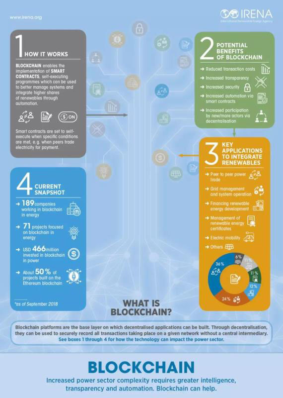 國際可再生能源署(IRENA)發(fā)布可再生能源領(lǐng)域的創(chuàng)新報告,介紹了區(qū)塊鏈在電力領(lǐng)域的應(yīng)用?;趨^(qū)塊鏈的智能合約可以提供推動實現(xiàn)電網(wǎng)的現(xiàn)代化,增加使用可再生能源,特別是難以吸納的間歇性來源,同時降低成本,加快交易流程。具體而言,區(qū)塊鏈的主要用途主要包括: