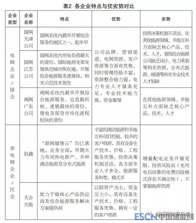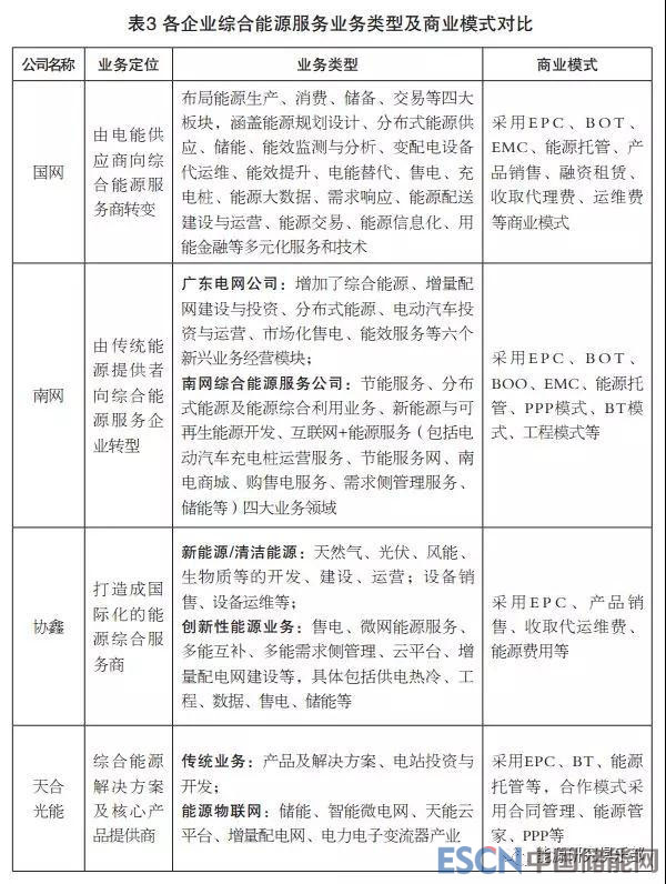 就企業(yè)對綜合能源服務業(yè)務的定位而言,國網(wǎng)、南網(wǎng)、協(xié)鑫都致力于向綜合能源服務商轉(zhuǎn)型,而天合光能致力于做提供綜合能源解決方案的服務商。就業(yè)務類型而言,由于園區(qū)、工業(yè)、大型公共建筑等對象承擔的能源價格較高、能源需求巨大、用能形式豐富,能夠取得較好的經(jīng)濟、環(huán)境、社會效益,目前,綜合能源服務企業(yè)一致將重點放在這三類服務對象上,統(tǒng)籌運用能效診斷、節(jié)能改造、用能監(jiān)測、分布式新能源發(fā)電、冷熱電三聯(lián)供、儲能等多種技術(shù),積極推進綜合能源服務業(yè)務。因此,其業(yè)務類型大致相近,且商業(yè)模式創(chuàng)新不足,均在積極探索中。見表3。