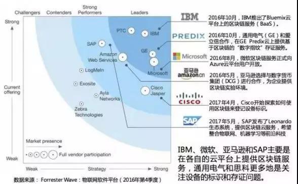 同時(shí),物聯(lián)網(wǎng)龍頭企業(yè)已經(jīng)在積極布局區(qū)塊鏈了。根據(jù)Forrester wave的物聯(lián)網(wǎng)報(bào)告顯示:IBM、PTC、GE、思科和微軟已成為占據(jù)物聯(lián)網(wǎng)平臺(tái)市場的主導(dǎo)企業(yè)。IBM、微軟、亞馬遜和SAP都在各自的物聯(lián)網(wǎng)云平臺(tái)上提供區(qū)塊鏈技術(shù)相關(guān)服務(wù),為未來海量的物聯(lián)網(wǎng)設(shè)備接入提供彈性資源池,做了超前布局。