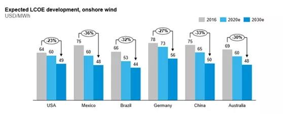 第二,清潔能源發(fā)展受限于高昂的經(jīng)濟成本的局面將得到改變。世界級風電公司維斯塔斯,提出了一個新的指標:LCOE,代表著標準化的發(fā)電成本,也就是說發(fā)一兆瓦電,成本是多少。據(jù)預測,中國到2030風電發(fā)電成本將降低33%,這也是風電發(fā)電行業(yè)的平均值。這將成為清潔能源發(fā)展的一個歷史性時代。
