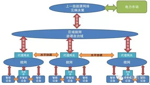 自底向上,分別是設(shè)備層、微網(wǎng)層、區(qū)域微網(wǎng)層和云端決策層,底層設(shè)備包括智能設(shè)備和帶有適配器的非智能設(shè)備,通過數(shù)據(jù)接口耦合到微網(wǎng)中,微網(wǎng)之間通過水平協(xié)調(diào)和同一級的其他微網(wǎng)系統(tǒng)進(jìn)行協(xié)調(diào),并通過垂直協(xié)調(diào)機(jī)制與上一級微網(wǎng)進(jìn)行協(xié)調(diào),再往上則是區(qū)域級微網(wǎng)或者能源自治域,與云端決策層或者更高級的協(xié)調(diào)中樞通過垂直接口進(jìn)行交互。