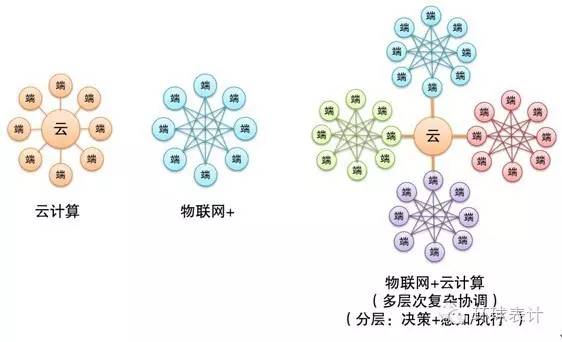 從交互和控制的角度看,由于能源互聯(lián)網(wǎng)的技術(shù)復(fù)雜度,單純的設(shè)備層智能化,不能解決大規(guī)模廣域協(xié)調(diào)的問題,而把所有計(jì)算資源都放到云端,也不能解決能源互聯(lián)網(wǎng)就地平衡和實(shí)時(shí)控制的需求,所以未來的能源互聯(lián)網(wǎng),應(yīng)該呈現(xiàn)出云-端多層次協(xié)調(diào)控制的形態(tài),也就是從云計(jì)算,到端計(jì)算,最終云-端混合協(xié)調(diào)。如下圖所示: