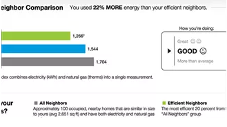 Opower通過(guò)自己的云平臺(tái)和數(shù)據(jù)整合能力來(lái)處理它所服務(wù)的公用事業(yè)公司取得的大量家庭能耗數(shù)據(jù),結(jié)合“行為科學(xué)理論”、房齡信息、周邊天氣等,運(yùn)用自己的軟件系統(tǒng)進(jìn)行用能分析,簡(jiǎn)歷家庭耗能檔案,并通過(guò)綜合分析提出節(jié)能建議。最吸引用戶眼球的地方是,Opower提供的報(bào)告里,除了用戶本身的用電數(shù)據(jù),還有相近區(qū)域內(nèi)最節(jié)能的20%的用戶耗能數(shù)據(jù),也就是所謂的“鄰里用電比較”,這提供給用戶非常直觀的節(jié)能動(dòng)力。