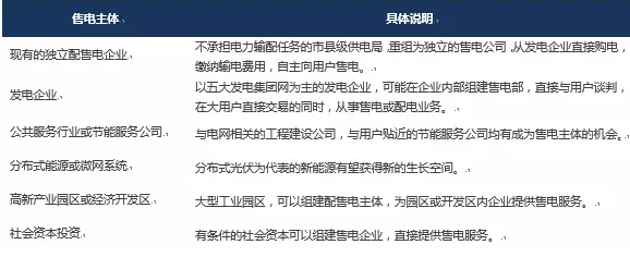 此輪電改“網(wǎng)售分開”是重要內(nèi)容,未來(lái)將引入六類售電主體,在售電端植入競(jìng)爭(zhēng)機(jī)制。在新一輪的電改方案中,明確了電網(wǎng)企業(yè)的公共服務(wù)屬性、改變了電網(wǎng)“吃差價(jià)”的盈利模式,最大的亮點(diǎn)在于網(wǎng)售分開,培育多種售電主體。新一輪電改以“放開兩頭、監(jiān)管中間”為原則,提出“四放開、一獨(dú)立、一加強(qiáng)”(輸配電價(jià)以外的經(jīng)營(yíng)性電價(jià)放開,發(fā)電企業(yè)和電力用戶可以直接協(xié)商電價(jià)并進(jìn)行交易;配電側(cè)放開,未來(lái)新增的配電業(yè)務(wù)允許社會(huì)資本進(jìn)入;售電業(yè)務(wù)放開,允許社會(huì)資本進(jìn)入;公益性和調(diào)節(jié)性以外的發(fā)供電計(jì)劃放開;交易平臺(tái)獨(dú)立;加強(qiáng)規(guī)劃。)