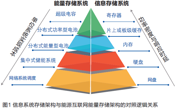 此外,能源互聯(lián)網(wǎng)中分布式儲(chǔ)能系統(tǒng)是分布式能源接入傳統(tǒng)能源系統(tǒng)的必要設(shè)備,所以分布式儲(chǔ)能系統(tǒng)的功能和性能定義應(yīng)與分布式能源接入需求匹配,正如信息領(lǐng)域中信息存儲(chǔ)系統(tǒng)的多樣性對(duì)應(yīng)于信息處理的不同要求。如圖所示,類似于信息存儲(chǔ)架構(gòu)從最上層的寄存器到最下層的互聯(lián)網(wǎng)存儲(chǔ),自上而下的單位存儲(chǔ)成本是逐步遞減的,但存儲(chǔ)系統(tǒng)的響應(yīng)速度和延遲中斷性能卻不斷增大,能源互聯(lián)網(wǎng)儲(chǔ)能系統(tǒng)架構(gòu)具有同樣的特征。能源互聯(lián)網(wǎng)中能量存儲(chǔ)系統(tǒng)的構(gòu)建需要應(yīng)對(duì)各種分布式電源無序隨機(jī)接入傳統(tǒng)電網(wǎng)的要求,我們需要引入軟件定義能量管控系統(tǒng),做到不同種類的能量存儲(chǔ)系統(tǒng)搭配使用,以達(dá)到降低單位成本,優(yōu)化系統(tǒng)性能的目的。